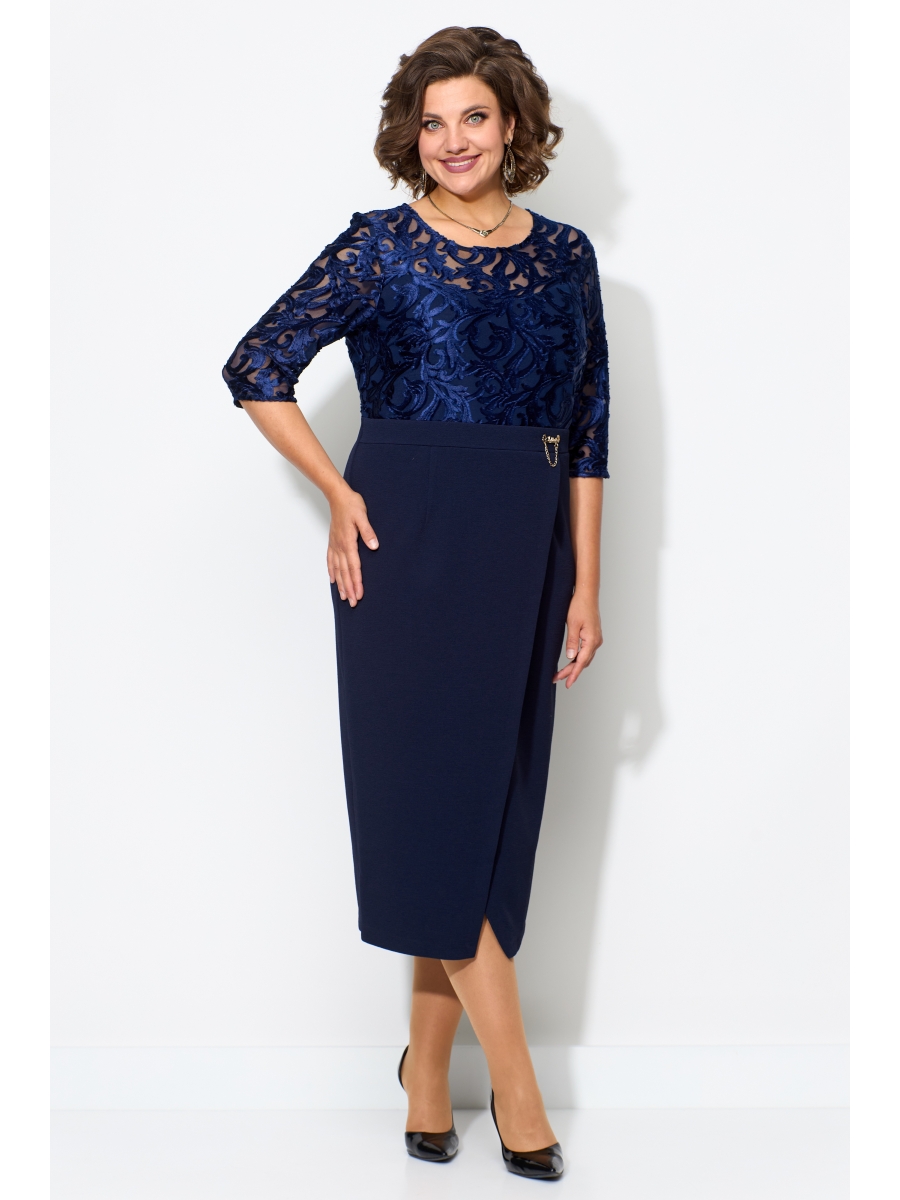 Нарядное платье приталенного силуэта, выполнено из комбинации двух тканей: вверх выполнен из гипюра,что придает платью нарядность, низ из комфортного плотного трикотажа с креп-эффектом на внешней стороне. По переду линия талии, выделена планкой. От талии к низу платье идет с запахом. Спинка со средним швом и таллиевыми выточками. Рукав втачной, 3/4.