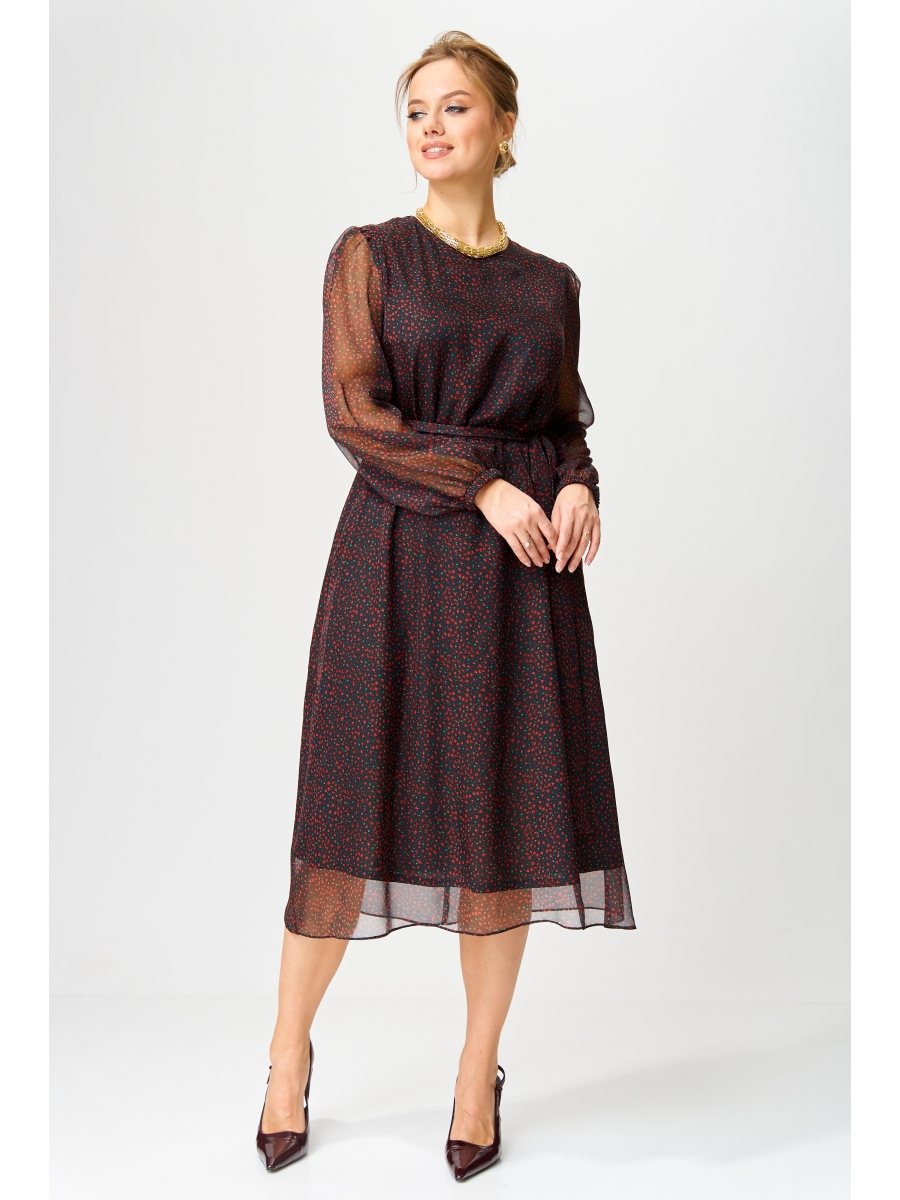 Платье шифоновое А-образного силуэта на подкладке. Перед с двумя нагрудными вытачками. Спинка со средним швом, вверху обработан разрезик с застежкой на петлю и пуговицу. Рукав длинный со сборкой по окату. Низ рукава на резинке шириной 2 см. Горловина округлой формы.