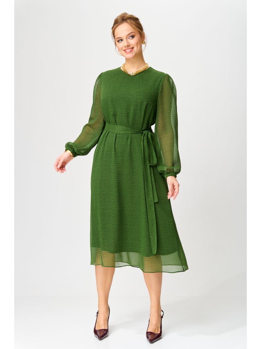 Платье шифоновое А-образного силуэта на подкладке. Перед с двумя нагрудными вытачками. Спинка со средним швом, вверху обработан разрезик с застежкой на петлю и пуговицу. Рукав длинный со сборкой по окату. Низ рукава на резинке шириной 2 см. Горловина округлой формы.