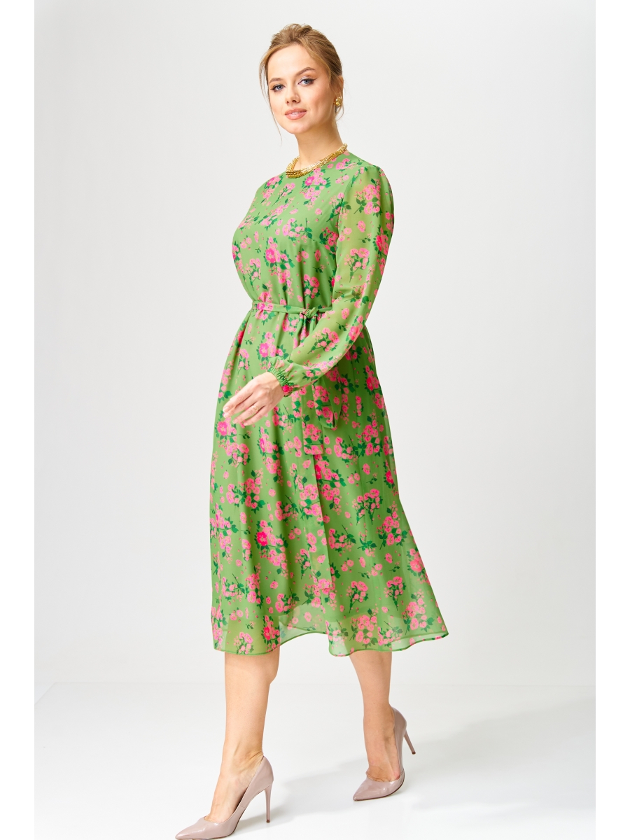 Платье шифоновое А-образного силуэта на подкладке. Перед с двумя нагрудными вытачками. Спинка со средним швом, вверху обработан разрезик с застежкой на петлю и пуговицу. Рукав длинный со сборкой по окату. Низ рукава на резинке шириной 2 см. Горловина округлой формы.