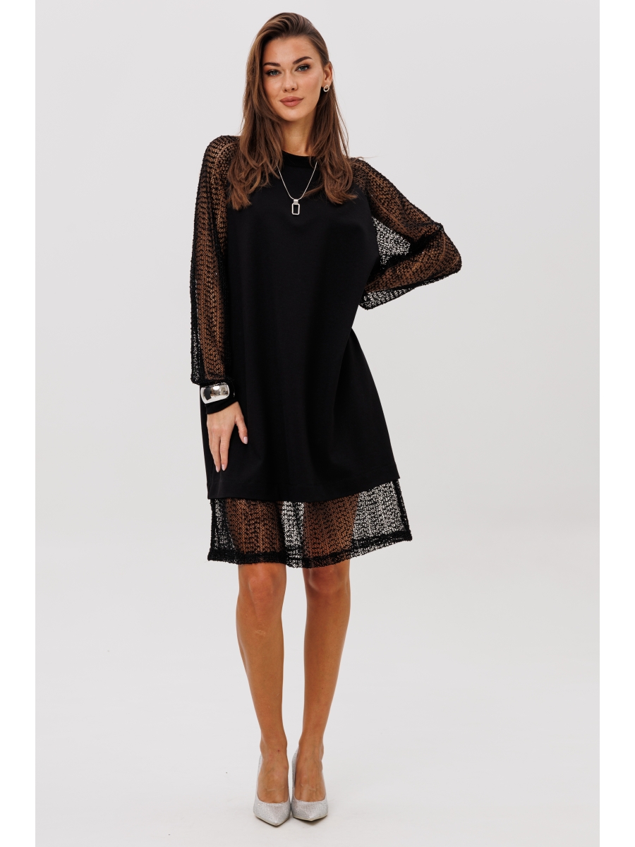 Стильное платье прямого кроя выполнено из комфортного, мягкого вискозного полотна с добавлением нейлона, которое красиво драпируется и не сковывает движения. Особый акцент — мерцающие прозрачные рукава и нижняя часть изделия, выполненные из изящной сетки с микропайеткой. Такой деликатный блеск добавляет образу утончённости и лёгкой вечерней нарядности.
