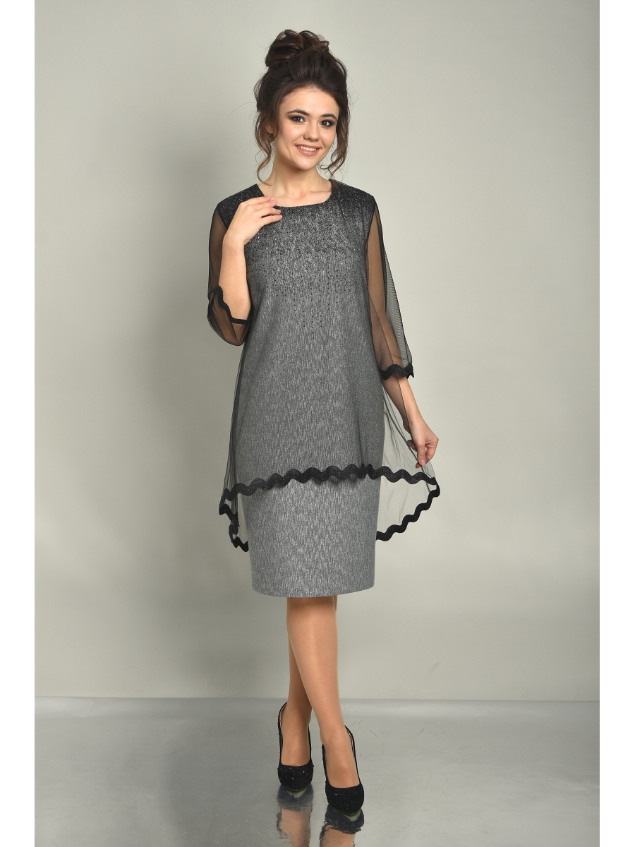 Шикарное платье, которое подойдет для любого предстоящего Вам торжества. Платье состоит из двух слоев, сшитых по пройме рукава и горловине. Нижний слой состоит из фактурного трикотажа с люрексом. Имеются вытачки на груди и сзади на талии. Верхнее платье состоит из сетки, а низ его обработан кружевом. (ПРИМЕЧАНИЕ! Кружево может отличаться от оригинала). Спереди верхнее платье короче, сзади длиннее. Рукав 3/4, манжеты состоят из кружева. Платье без застежки.