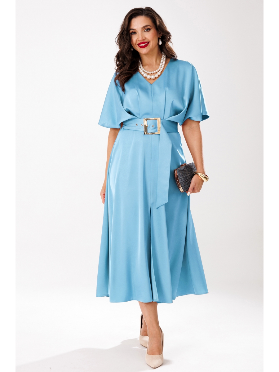 Элегантное нарядное платье, выполнено из роскошной струящейся плательной ткани с добавлением вискозы. Платье с V-образным вырезом горловины, отрезное по линии талии. Верхняя часть платья выполнена в свободном стиле со спущенной линией плеча и глубокими складками на линии талии, что придает платью особый стиль и шарм. Юбка платья с расклешением, по переду с разрезом. В боковом шве платья потайная молния застежка. Рукав цельнокроеный, объёмный, со спущенной линией плеча. В комплекте к платью идет съемный пояс с шикарной золотой пряжкой. Модель удобная и практичная, вы будете в нем выглядеть неотразимо и нарядно.
