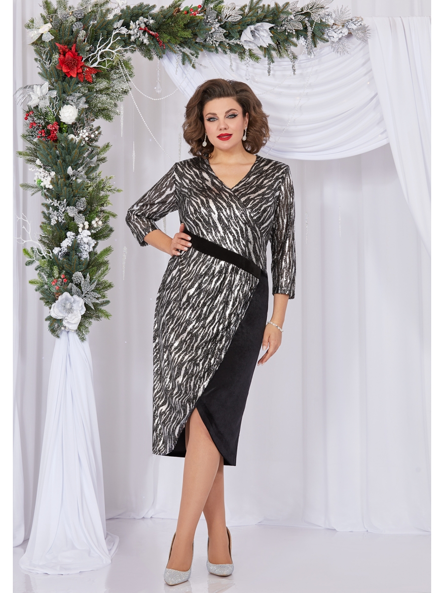 Нарядное женское платье полу-прилегающего силуэта, выполнено из эластичной ткани с принтом и расшитой пайетками (на трикотажной подкладке), в сочетании с однотонным велюром. На полочке выполнен V-образный вырез горловины, лиф платья выполнен из принтованной, эластичной ткани , расшитой пайетками (на трикотажной подкладке), по линии талии лиф с фигурным подрезом и вставкой однотонного велюра. Юбка платья выполнена из заходящих друг на друга половинок юбки, одна выполнена из принтованной эластичной ткани (на трикотажной подкладке), вторая часть юбки выполнена из однотонного велюра. Рукав втачной, оптимальной длины, выполнен из эластичной принтованной ткани, расшитой пайетками. Спинка выполнена из однотонного велюра, со средним швом и вытачками. Роскошное платье для обладательниц роскошных форм!