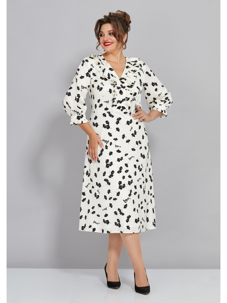 Женское платье, полу-прилегающего силуэта, выполнено из принтованной плательной ткани, на трикотажной подкладке. Лиф платья отрезной по линии талии, с вытачками, вырез горловины V-образной формы, обработан обтачкой и присборенной рюшей из основной ткани. Юбка платья расклешенного силуэта, спинка идентична полочке, со средним швом и вытачками, в среднем шве потайная молния. Рукав втачной, оптимальной длины, присборен по низу на манжет с рюшей. Элегантное платье, в стильных расцветках отличный выбор для офиса и торжественного случая!