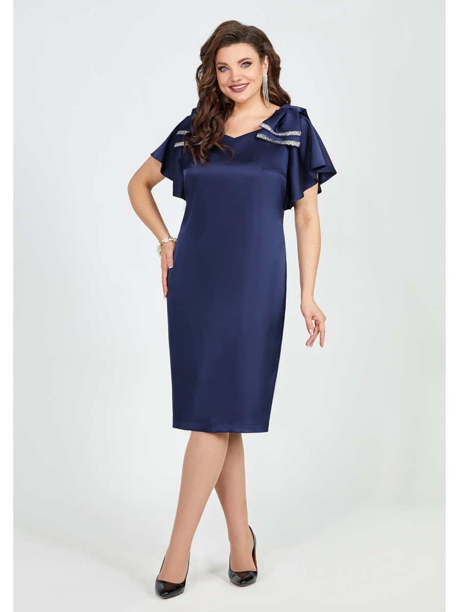 Элегантное, женское платье полу-прилегающего силуэта, выполнена из плотного атласа, на трикотажной подкладке. Горловина платья фигурной формы, обтачена подкладкой, также на полочке выполнены нагрудные вытачки. Спинка со средним швом и вытачками, в среднем шве потайная молния, по низу шлица. Пройма обработана воланом из атласа, плечевые швы декорированы бантами из атласа, декорированы стразами. Эффектное и стильное платье отлично подойдет как для мероприятий, так и для повседневной жизни, если снять банты.