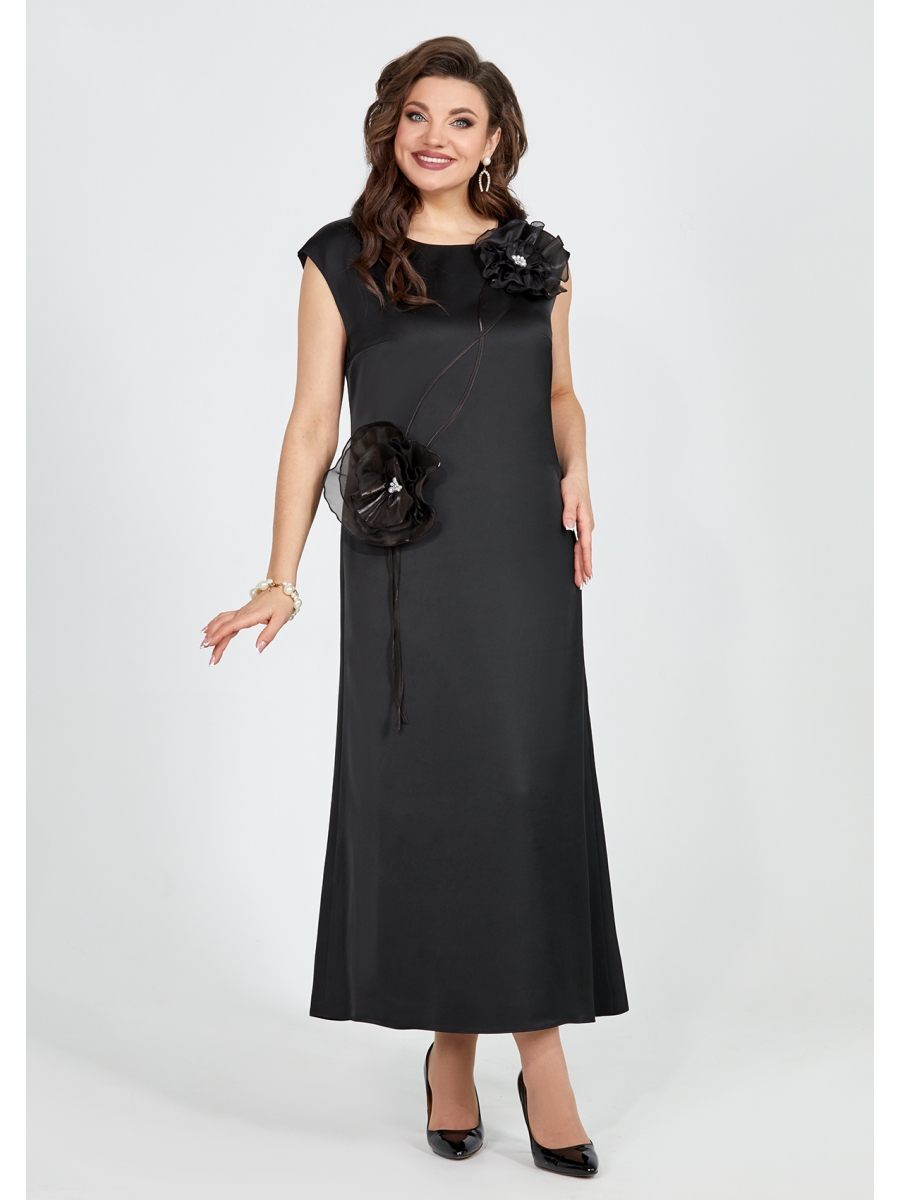 Эффектное, женское платье полу-прилегающего силуэта, выполнено из плотного атласа, на трикотажной подкладке. Горловина округлой формы, обтачена подкладкой, также на полочке выполнены нагрудные вытачки. Спинка со средним швом, в среднем шве потайная молния. Платье декорировано цветами, которое можно снять для удобства ухода за изделием. Эффектный декор платья прекрасно дополнит ваш образ, а стильное сочетание фактур тренд этого сезона.