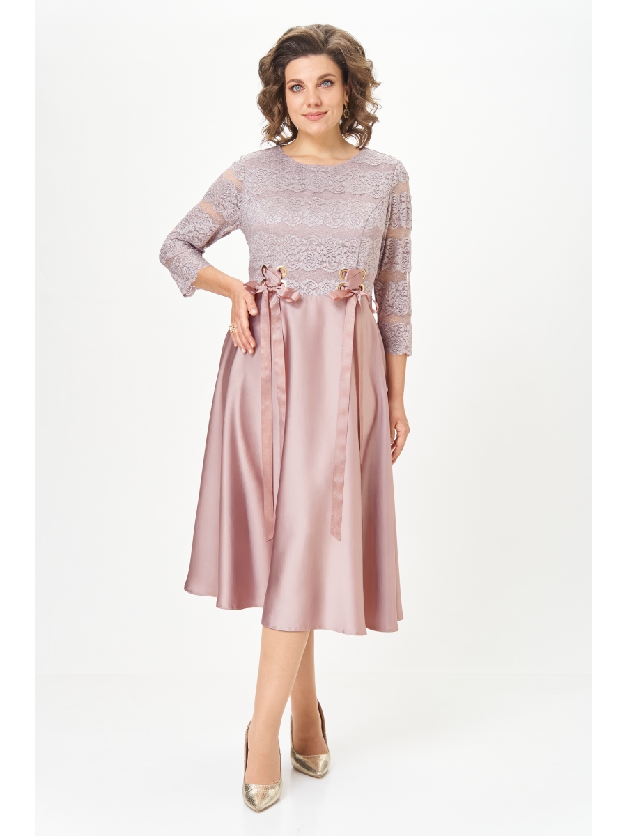 Нарядное женское платье полу-прилегающего силуэта, выполнено из гипюра с глитером и атласа. Лиф платья отрезной по линии талии, выполнен из гипюра с глитером. Горловина платья округлой формы, на обтачке, на полочке выполнены рельефы, по рельефам обработаны люверсы с декоративной лентой. Юбка платья расклешенного силуэта, из атласа, спинка идентична полочке, со средним швом и рельефами, в среднем шве потайная молния. Рукав втачной, оптимальной длины, выполнен из гипюра с глитером.
