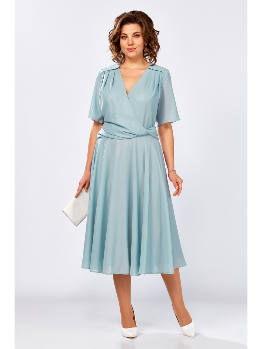 Женское платье полу-прилегающего силуэта, выполнено из шифона с блеском, на трикотажной подкладке. Лиф платья отрезное по линии талии, горловина V-образной формы. Правая часть полочки отлетная по линии талии, с перекрутом по левому боку, по линии плеча обработаны кокетки, декорированные стразами, от кокетки на полочке заложены складки. Юбка платья расклешенного силуэта, выполнена из основной ткани, на подкладке. Спинка отрезная по линии талии, со средним швом и вытачками, в среднем шве потайная молния. Рукав втачной, укороченный, из основной ткани. Эффектное платье с оригинальным конструктивным решением прекрасно скроет нюансы фигуры и подчеркнет талию.