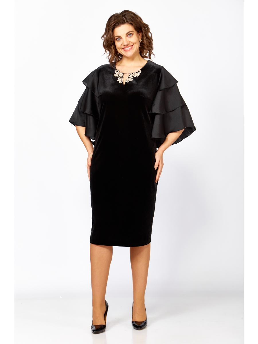 Женское платье полу-прилегающего силуэта, выполнено из велюра и крэш-атласа. Горловина платья округлой формы, на обтачке, декорирована небольшим разрезом и украшена аппликацией и цепочкой. Спинка платья со средним швом и вытачками, выполнена из велюра. Рукав втачной, выполнен из крэш-атласа, состоит из расклешенных воланов в три яруса, что придает платью нарядности.