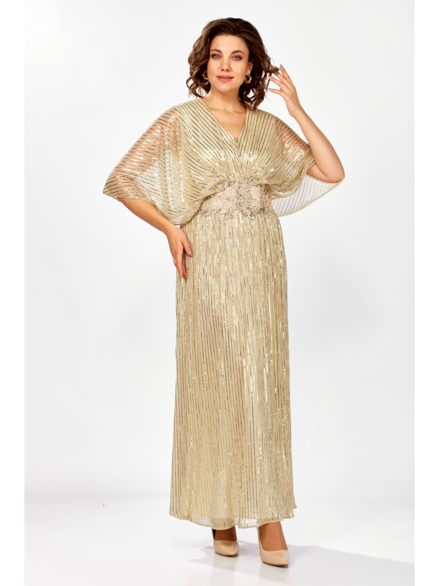 Нарядное женское платье, полу-прилегающего силуэта, выполнено из плиссированной ткани с пайетками. Лиф платья с V-образной горловиной, по линии талии отрезной, на резинке. Лиф платья двойной, нижняя часть из атласа, верхняя часть свободного покроя из плиссированной ткани, со спущенным рукавом, по линии талии декор в виде аппликации из кружева. Юбка расклешенного силуэта, присборена по линии талии, на подкладке. Спинка идентична полочке, отрезная по линии талии, с резинкой.