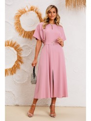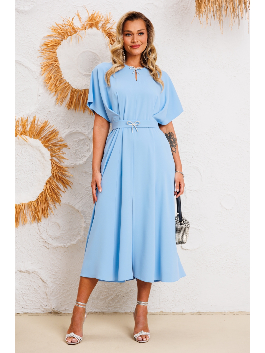 Элегантное нарядное платье, выполнено из роскошной струящейся плательной ткани с добавлением вискозы. Платье с округлой горловиной и вырезом капелькой, украшенной тесьмой в виде бантика. Платье отрезное по линии талии, верхняя часть платья выполнена в свободном стиле со спущенной линией плеча и глубокими складками на линии талии, что придает платью особый стиль и шарм. Юбка платья с расклешением, по переду с разрезом. В центральном шве платья потайная молния застежка. Рукав цельнокроеный, объёмный, со спущенной линией плеча.