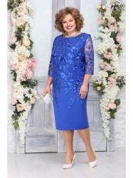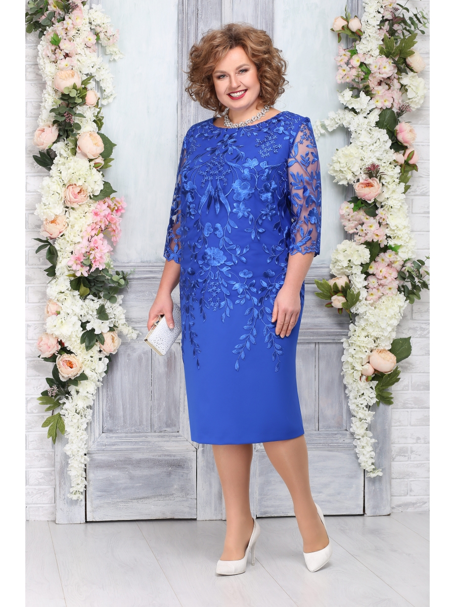 Платье женское, полуприлегающего силуэта, чуть зауженное к низу. Длина изделия по среднему шву спинки 106,0 см. На детали переда и спинки нашит гипюр с опущенными веточками к низу изделия. Нагрудные выточки выходят из проймы. В среднем шве спинки обработана застёжка на потайную тесьму молнию и шлица. Горловина круглая, углублённая спереди, обтачная. Рукава втачные, одношовные, длиной 45,0 см. из гипюра с фестонами внизу, пройма окантованная.