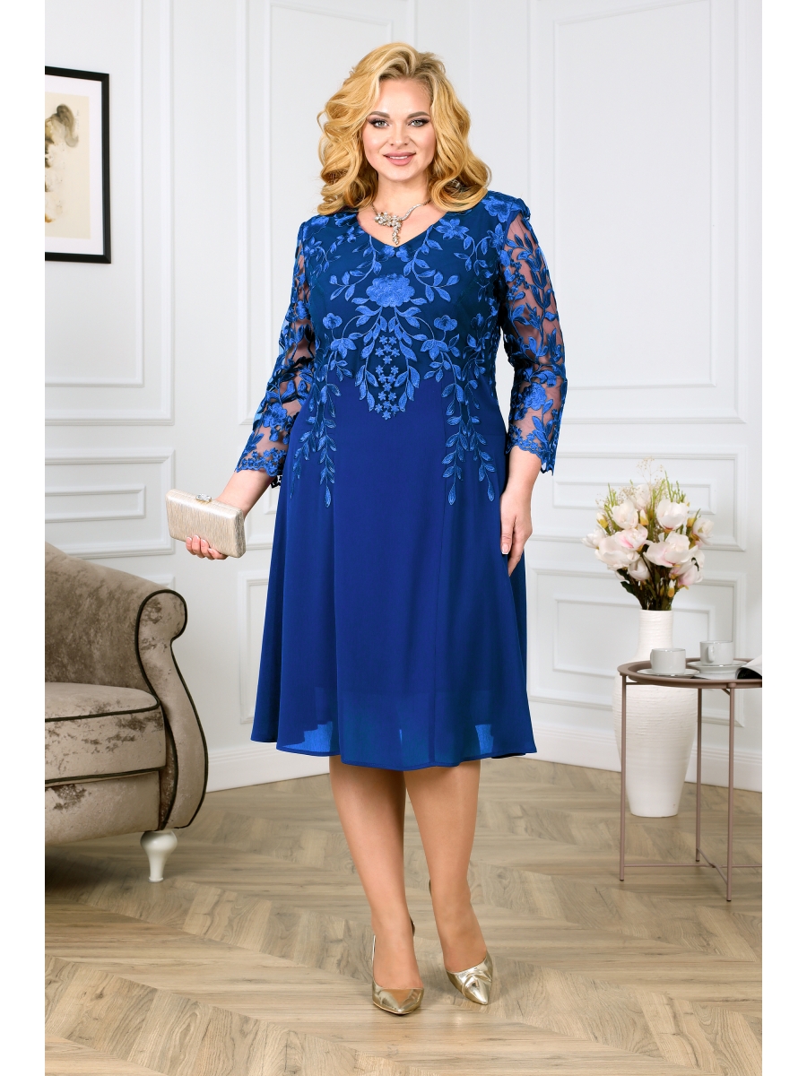Платье женское, полуприлегающего силуэта, расширенное к низу, на подкладке из дышащей, приятной на ощупь и достаточно эластичной ткани, отрезное по линии талии. Длина платья по среднему шву спинки 106 см. На верхнюю часть лифа нашит гипюр, с нагрудными выточками, переходящий вниз нашивными аппликациями. Рельефы переда выходят из проймы, проходят через центр груди вниз. Рельефы спинки выходят из проймы вниз, в среднем шве обработана застёжка на потайную тесьму молнию. Ниже линии талии на боковых частях горизонтальные подрезы. Расширение низа юбки за счёт отрезных бочков. Горловина углублённая спереди, обтачная, фигурная. Рукава втачные, двухшовные, выполнены из кружева. Изделие с плечевыми накладками.