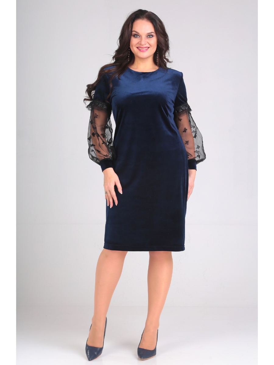 Платье женское, приталенное, зауженное к низу. Спинка целая, с талевыми вытачками. На полочке нагрудная вытачка направлена от бокового шва вверх по косой линии. Горловина углубленная, круглая, на обтачке. Рукав выполнен с двух частей. Верхняя часть и манжет с основной велюровой ткани, а нижняя часть из сетки с флоком. Низ рукава собран на манжет.