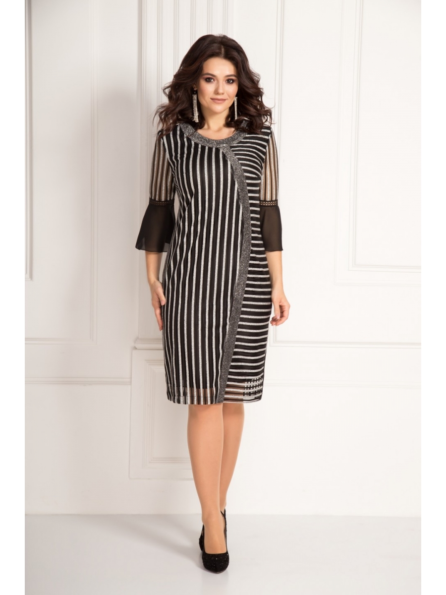 По горловине полочки притачная деталь в цвет платья. Украшением платья служит игра рисунка ткани, в нашем случае это полоска, которая с одной стороны изделия вертикально, а с другой горизонтально и разделена между собой планкой. По полочке нагрудные выточки. Спинка со средним швом. Потайная молния вставлена в средний шов спинки. По спинке две талевые выточки. Для удобства ходьбы по низу шлица. Рукав выполнен из основной ткани и волана из шифона, разделенных между собой кружевом. Длина рукава ниже локтя. Платье на трикотажной подкладке.