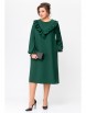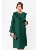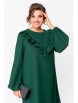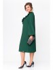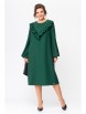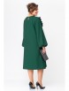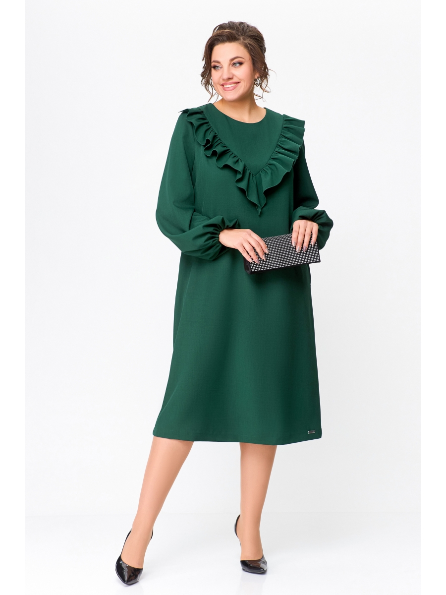 Платье женское прямого силуэта. Выполнено из плательной ткани. Платье с длинными объёмными рукавами, по низу которых, вставлена эластичная тесьма. От линии плеча до центральной части переда, расположена отрезная кокетка, в которую вставлен декоративный волан на сборке. В нижней части платья пришит фирменный логотип. Спинка платья цельнокроеная. В области горловины - капелька, застёгивающаяся на навесную петлю и декоративную пуговицу.