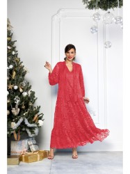 Оформить заказ →Вечернее платье макси из кружевного полотна, на подкладке, трапециевидного силуэта - дополнение любого образа. Отличный вариан на любое торжество. По горловине V-образный вырез и стойка переходящая в бант. Рукав расширенный к низу, на резинке, фигурный. По полочке и спинке идут 3 присобранных волана.