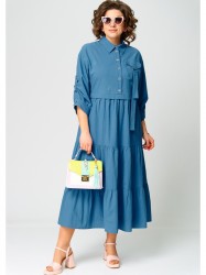 Платье женское нарядно-повседневное полуприлегающего силуэта до талии и расширенное к низу. Выполнено из плательной ткани в сочетании с отделкой. Платье отгрезное по талии. В боковых швах обработаны карманы, по переду юбки отделочные ввставки в виде вертикальных полос и центральный шов с разрезом, по спинке встречные склада. Вырез горловы воротник на стойке рубашечного типа. Застежка до талии на обментанные петли и пуговицы. Рукав втачной 7/8 по низу на притачной манжете, в рукаве отделочная пата с помощью которой можно регулировать длину рукава.