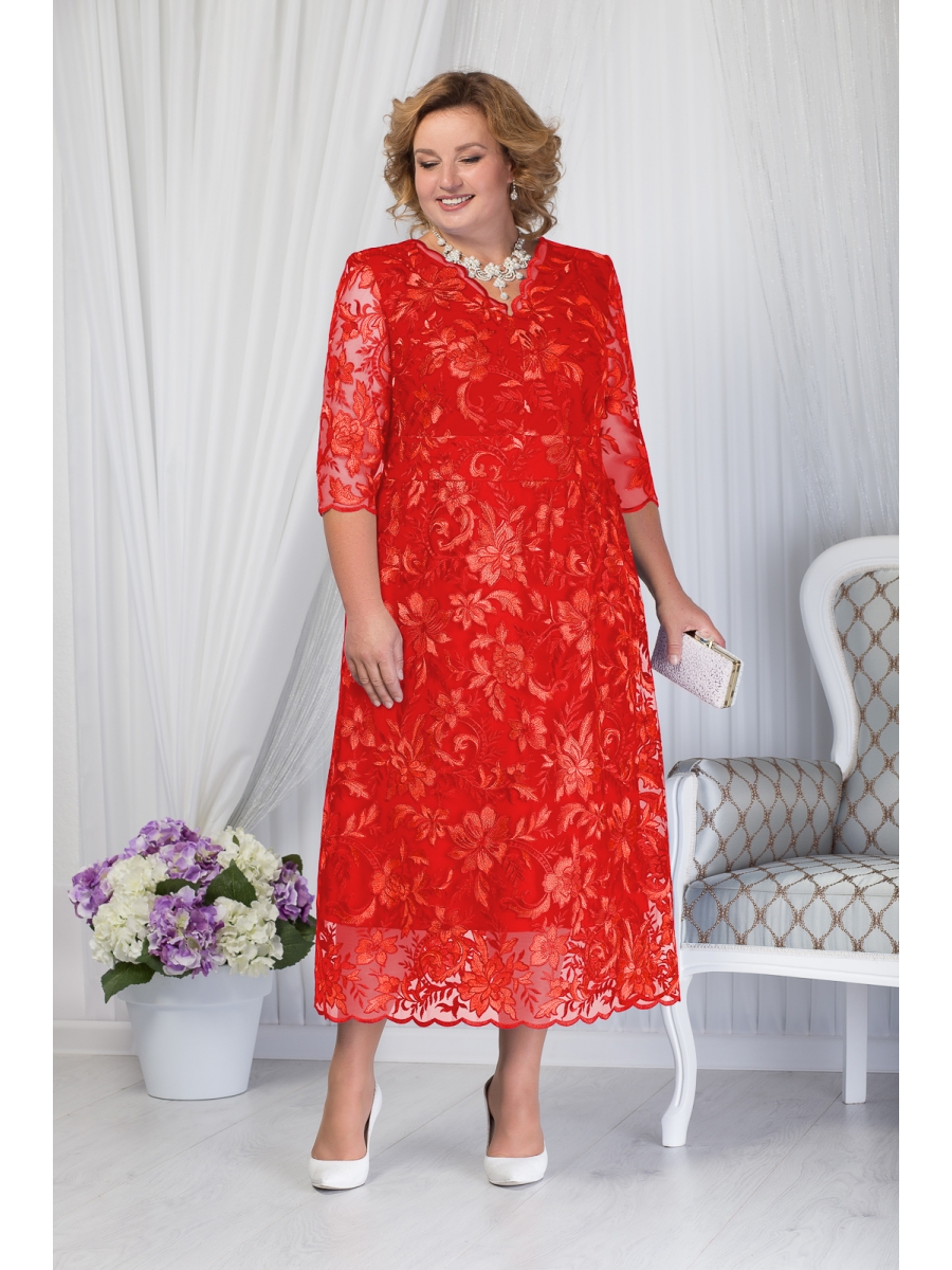 Платье женское, отрезное по линии талии со вставкой в виде пояса. Длина посередине спинки 125,0 см. Детали переда и спинки двухслойные, нижняя часть из основной ткани, верхняя из кружева. Детали переда со средним швом и нагрудными выточками, которые выходят из проймы. На V-образной горловине переда край кружева с фестонами отлетной. Нижняя часть горловины окантованная. Детали спинки без швов, на нижней части талевые выточки. Горловина спинки обтачная. Нижняя часть юбки на спинке со средним швом. Верхняя юбка со сборкой по шву притачивания к поясу, внизу с фестонами. Рукава из кружева длиной 42,0 см внизу с фестонами, пройма окантованная. В левом боковом шве обработана застёжка на потайную тесьму молнию. Изделия с плечевыми накладками.
