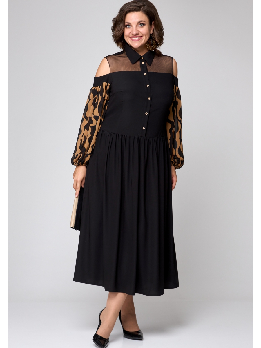 Платье женское нарядное полуприлегающего силуэта с заниженной талией, выполнено из плательной ткани в сочетании с сеткой. Вырез горловины воротник на стойке рубашечного типа, застежка до подреза на обметанные петли и пуговицы. Рукав втачной с открытым плечом со сборкой по верху и по низу. Низе рукава собран не резинку. Юбка платья со сборкой по верху. Декором служат отделочные пуговицы и вставки из сетки по верху платья.