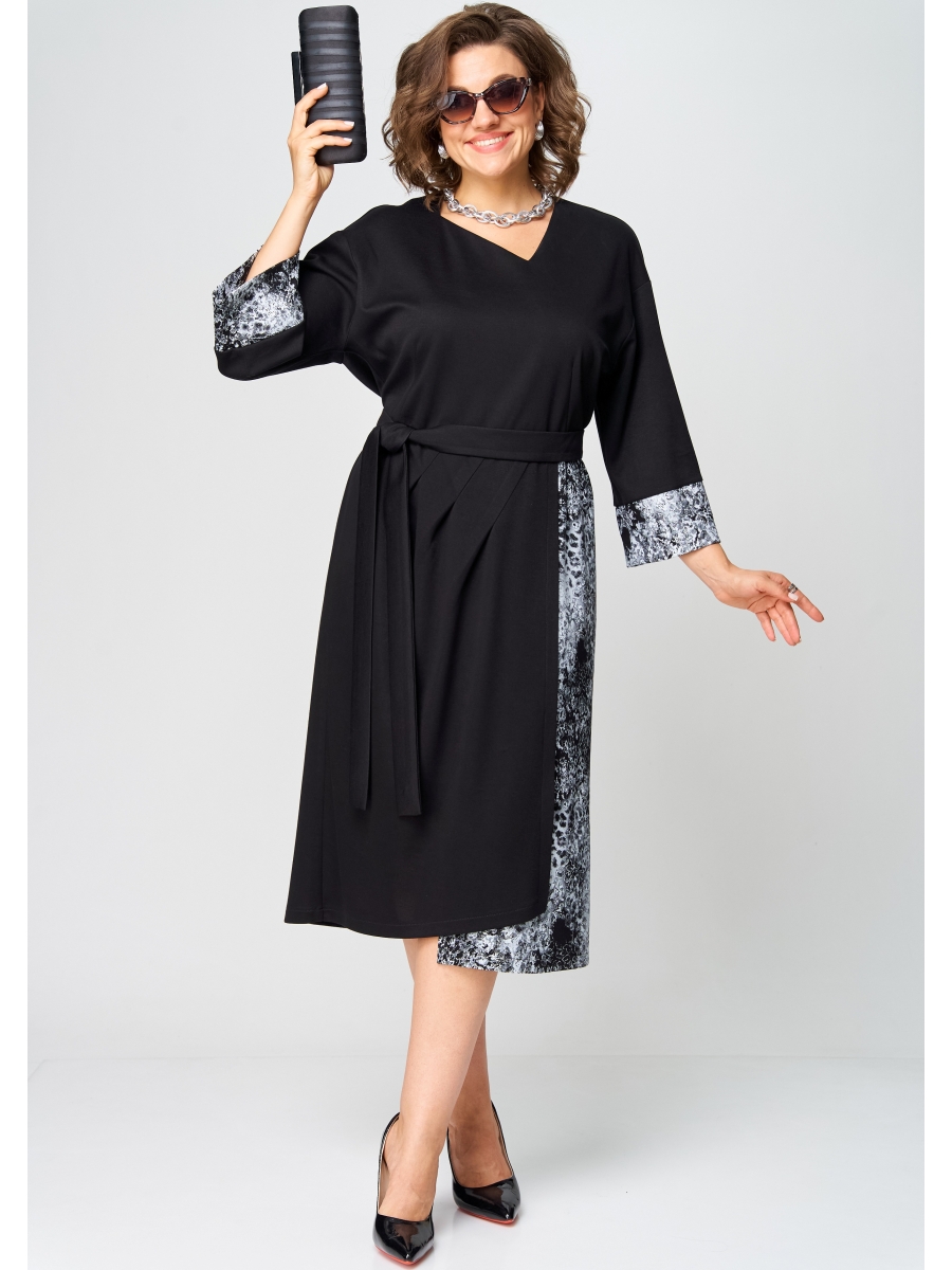 Платье женское повседневное полуприлегающего силуэта, выполнено из трикотажного полотна двух дизайнов. Вырез горловины фигурный на обтачке. Плечо спущенное. Рукав втачной 7/8, по низу на притачной манжете из отделочной ткани. По переду юбки фигурные складки и ассиметричный запах со вставкой из отделочного трикотажа.