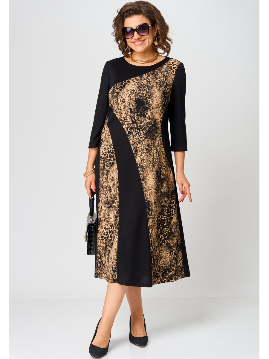 Платье женское повседневное полуприлегающего силуэта расширенное к низу, выполнено из трикотажного полотна двух дизайнов. Вырез горловины круглый на обтачке. Рукав втачной 3/4. Спинка платья выполнена из однотона, полочка с отделочными вставками из цветного трикотажа. В одном боковом шве обработан разрез.