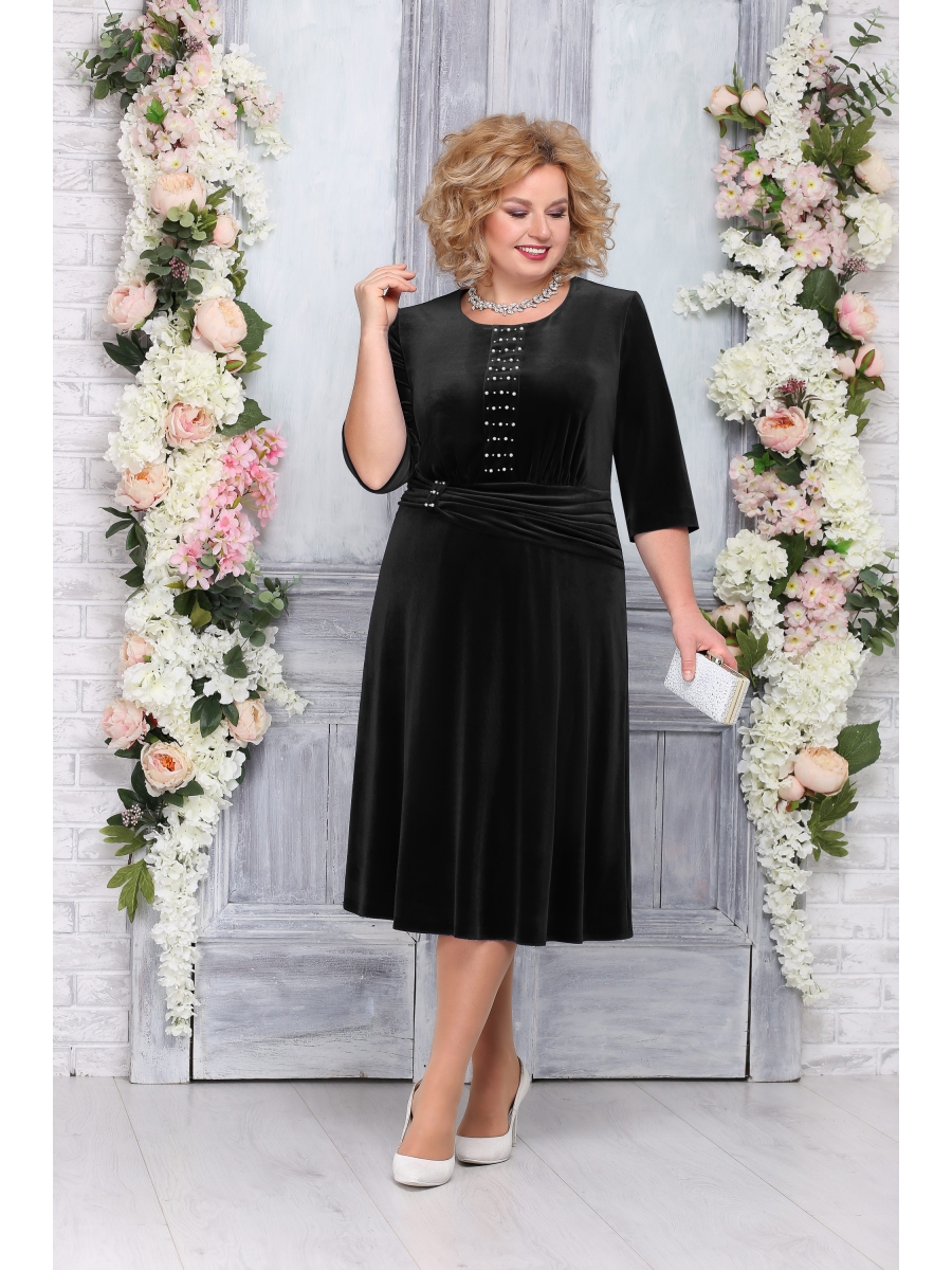 Платье женское, полуприлегающего силуэта, расширенное к низу, на подкладке из дышащей, приятной на ощупь и достаточно эластичной ткани. Длина платья по среднему шву спинки 110,0 см. Верхняя часть переда с вертикальным подрезом, вставка с вышивкой из больших и маленьких бусинок, на месте талевых выточек сборка. В шов притачивания юбки вставлена отлетная деталь с вышитой бусинками перемычкой, и со складками в боковом шве. Спинка с талевыми выточками и со средним швом, в котором обработана застёжка на потайную тесьму молнию. Горловина круглая, обтачная, углублённая спереди. Рукава втачные, одношовные, длиной 42,0 см. Изделие с плечевыми накладками.