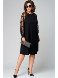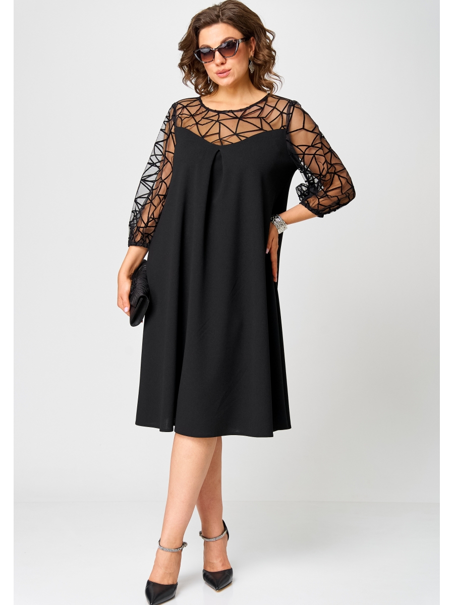 Платье женское нарядное А-силуэта выполнено из плательного крепа в сочетании с отделкой. Вырез горловины круглый обработан косой бейкой. Рукав втачной 7/8по низу на притпной резинке. В боковых швах обработаны карманы. По переду платья фигурная кокетка из отделочной ткани. По центру платья под кокеткой встречная складка.