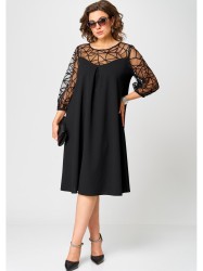 Платье женское нарядное А-силуэта выполнено из плательного крепа в сочетании с сеткой с набивным декором. Вырез горловины круглый обработан бейкой из отделочной ткани, рукав реглан по низу на притачной манжете. В боковых швах обработаны карманы. По спинке декоративная вставка из отделочной ткани.