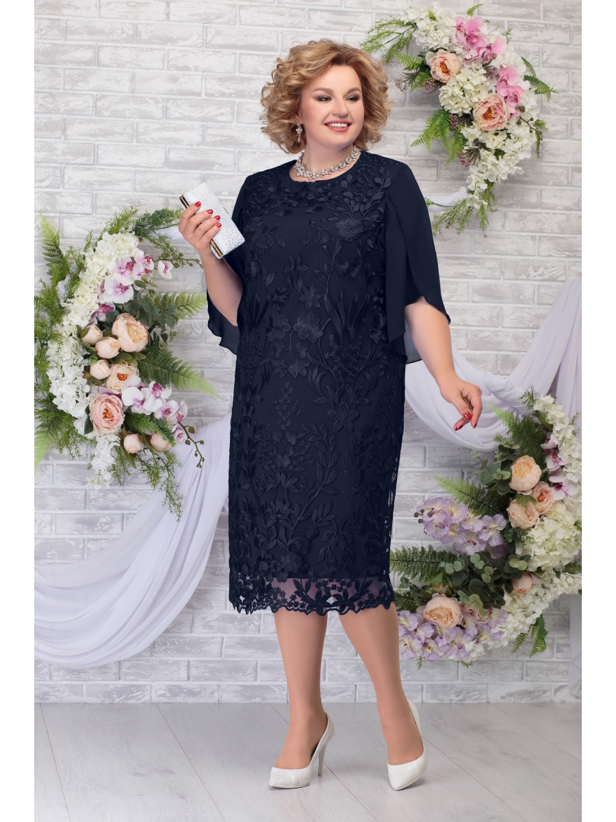 Платье женское, полуприлегающего силуэта, к низу чуть расширенное, двойное, нижняя часть из тонкой плательной ткани, верхняя из кружева. Длина по среднему шву спинки 110,0 см. по гипюру. Нагрудные выточки выходят из проймы. Нижняя спинка с талевыми выточками. В среднем шве спинки обработана застёжка на потайную тесьму молнию и разрез. Горловина круглая, углубленная спереди, обтачная. Шифоновые рукава, без швов, на запах по верхней части оката, длиной 41,0 см. Изделия с плечевыми накладками. Низ платья украшен фестонами.