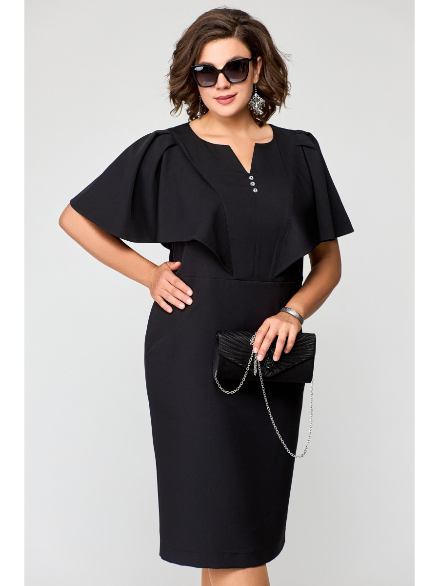 Платье женское нарядное прилегающего силуэта выполнено из костюмно-плательной ткани. Вырез горловины фигурный, обработан обтачкой. Рукав двойное крыло-волан входящий в рельефы платья. Пройма обработана обтачкой. По спинке потайная тесьма молния и разрез. Декором служат три отделочные пуговицы.