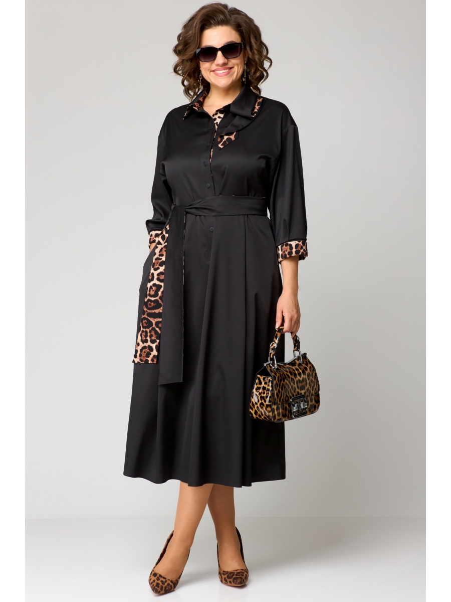 Платье женское нарядно-повседневное полуприлегающего силуэта расширенное к низу выполнено из плательной ткани в сочетании с отделкой с анималистичным принтом. Вырез горловины ассиметричный воротник на стойке рубашечного типа с левой стороны переходящий в отделочный элемент закрепленный на верхней части полочки. По центру застежка ниже талии на обметанные петли и пуговицы. Плечо спущенное, рукав втачной по низу со складками на притачной манжете. В боковых швах обработаны карманы.