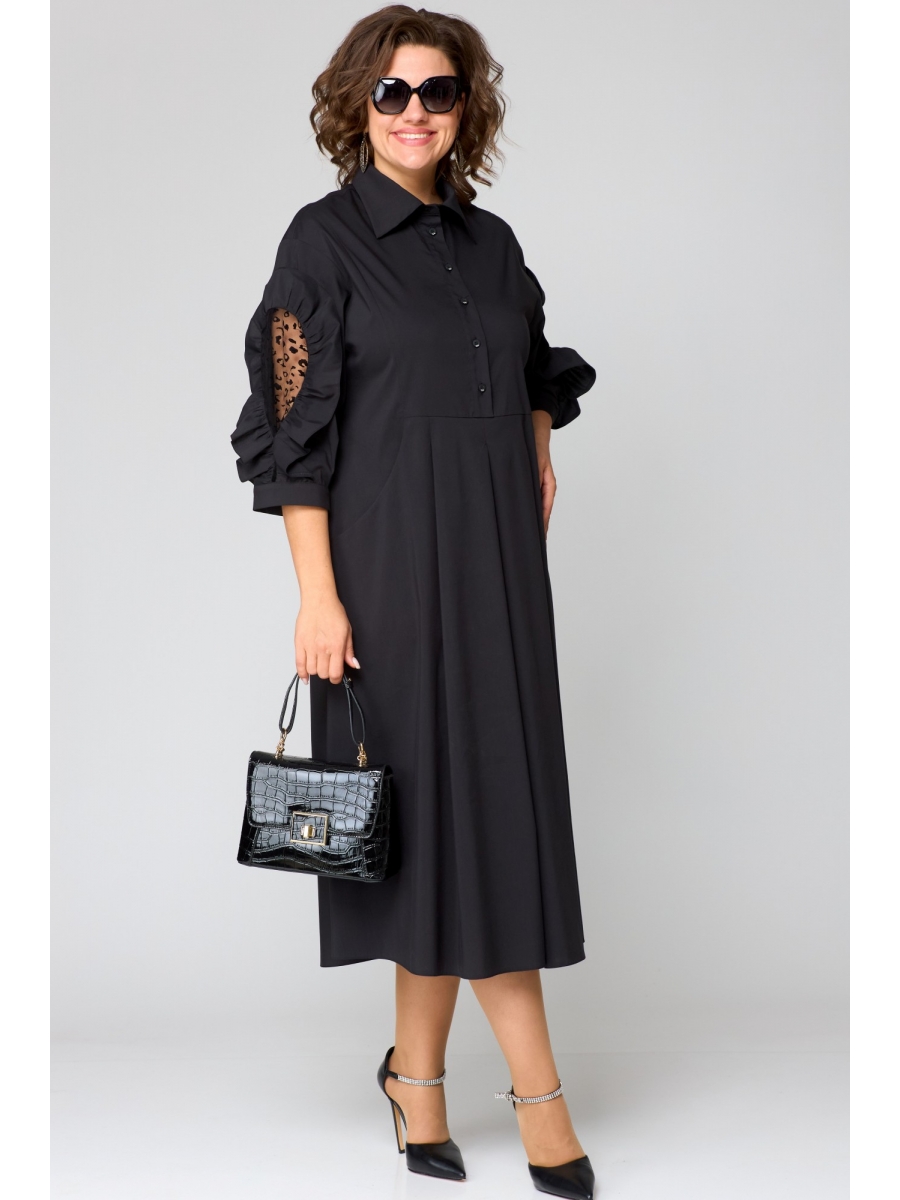Платье жнское нарядно-повседневное полуприлегающего силуэта расширенное к низу выполнено из хлопка. Вырез горловины воротник на стойке рубашечного типа, застежка до талии на петли и пуговицы. Плечо спущенное, рукав втачной с декоративным элементом по центру в виже кружева и рюши. По низу рукв на манжете. По переду в рельефах платья обработаны карманы. По спинке кокетка и встречная складка.