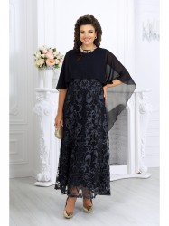 Платье женское, выполнено из гипюра и плательной ткани «сатин». Перед и спинка состоят из двух разных по длине слоев: нижний короче верхнего на 10 см. Модель без подкладки, без рукавов и плечевых накладок, без воротника. Платье отрезное по линии талии, с лифом прилегающего силуэта и расширенной к низу юбкой. Верхний и нижний слои материалов лифа скреплены по горловине, проймам, плечевым и рельефным швам переда и спинки. Верхний и нижний слои юбки скреплены только по лини талии; на переднем и заднем полотнищах верхней юбки обработаны рельефные швы. В среднем шве спинки предусмотрена застежка на потайную тесьму-«молнию» (50см). Вырез горловины переда и спинки округлый, углубленный по переду. Платье дополняется пелериной из шифона, разъемной по середине спинки; низ пелерины асимметричный, укороченный спереди. Пелерина пристегивается по горловине платья на 2 навесные петельки и 2 маленькие пуговицы. Длина платья (верхний слой) - 133 см. Длина пелерины – 128 см.
