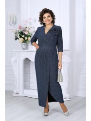 Платье женское полуприлегающего силуэта, выполнено из трикотажного полотна с фактурной лицевой стороной «люрекс». Модель на трикотажной подкладке, с плечевыми накладками. На правой части переда, вдоль отрезного пояса, заложены косые односторонние складки; детали лифа и юбки скреплены на запах. Низ платья асимметричный: правая часть переда -- удлинена к центру и оформлена углом, левая -- скругленная и входит в правый боковой шов. На спинке обработаны талиевые вытачки. В левом боковом шве предусмотрена застежка на потайную тесьму-«молнию» (35 см). Рукав длиной 3/4, втачной. Платье дополнено съемным «цветком» из основного полотна. Длина платья-138 см; длина рукава-41 см.
