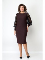 Платье женское из двух видов ткани. По переду из цветного трикотажа люрексовой нитью, а по спинку из однотонного трикотажа. По переду нагрудные выточки. Главным украшением платья служат рукава из двойной сетки, заканчивающийся манжетой из основной ткани. По спинке талевые выточки выгодно корректирующие фигуру. Застежка- потайная молния по среднему шву спинки, заканчивается шлицей.