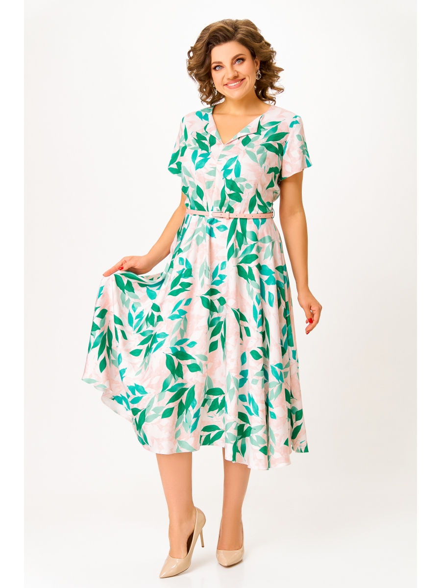 Платье из струящейся вискозной ткани, отрезное по линии талии. Лиф полуприлегающего силуэта. По полочке лифа центральный шов, нагрудные и талиевые вытачки, по спинке средний шов и талиевые вытачки. Горловина V-образной формы с отложным воротничком. Юбка расклешённая. Рукав втачной короткий, формы «тюльпан». В среднем шве спинки застёжка на потайную тесьму-молнию.
