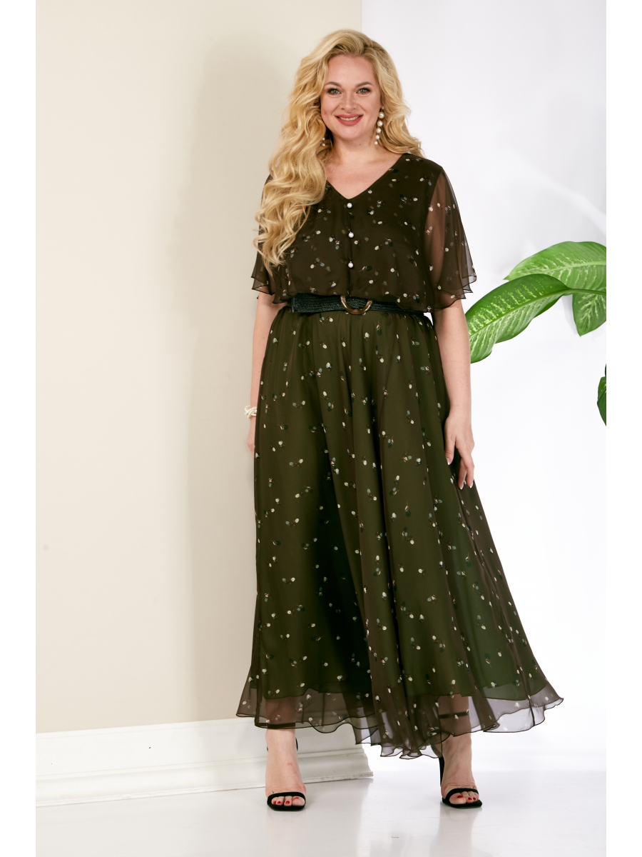 Платье женское из шифоновой ткани, отрезное по линии талии, на резинке. В верхней части платья идет отлетная кокетка по спинке и полочке в виде пелерины, по кокетке идет отделка в виде пуговиц, вырез V-образной формы. Полочка и спинка на подкладке. К платью идет съемный пояс. Юбка фасона "солнце", по полочке идет разрез по линии колена. Юбка на подкладке с разрезом.