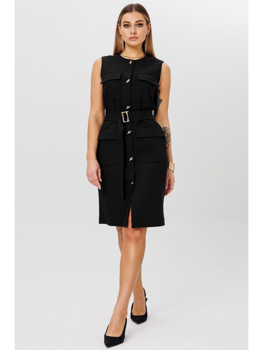 Горловина платья округлой формы, обработана обтачкой. Перед с нагрудными вытачками и карманами с клапаном. Застежка центральная на петли и пуговицы. Пройма обработана обтачкой. Спинка со средним швом и талиевыми вытачками.