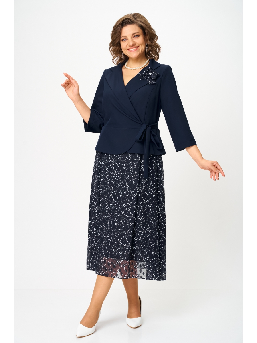 Элегантное женское платье, выполнено в виде имитации костюма из двух видов ткани. Лиф из плательной ткани, юбка из шифона. Платье с запахом, горловина с воротником пиджачного типа с отложными лацканами. Рукава втачные, длина 3/4.