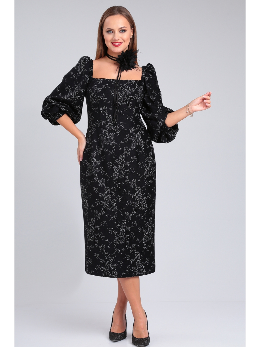 Платье из костюмно-плательной ткани приталенного силуэта длиной чуть ниже колена. Вырез горловины квадратной формы - каре. Отрезное по линии талии. Перед и спинка с рельефами. По спинке средний шов, в котором вставлена потайная молния, внизу разрез. Рукав втачной широкий длинный, по окату собран на резинку. Длинный рукав легко превратить в три четверти с помощью резинки, вставленной по низу рукава.