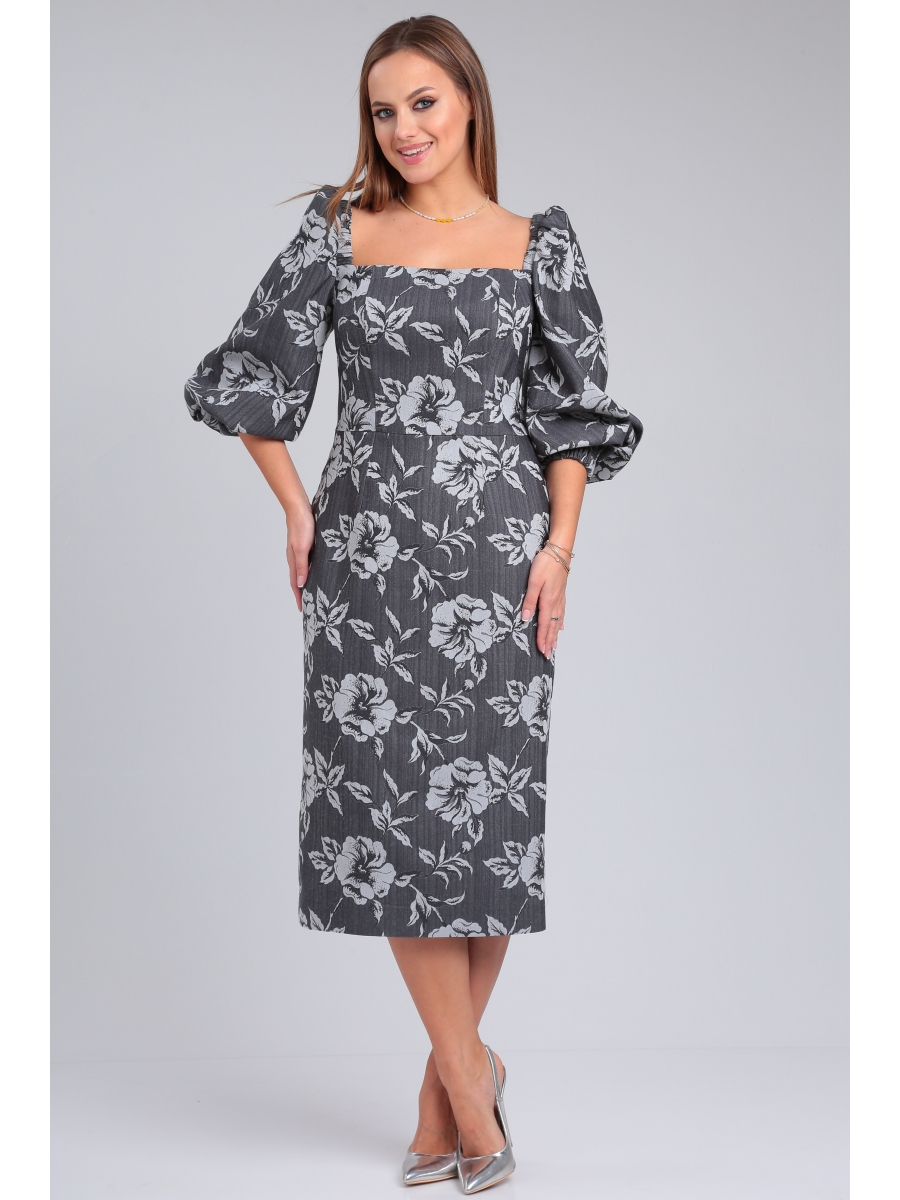 Платье приталенного силуэта длину чуть ниже колена из костюмно-плательной ткани. Вырез горловины квадратной формы. Отрезное по линии талии. Перед и спинка с рельефами. По спинке средний шов, в котором вставлена потайная молния, внизу разрез. Рукав втачной широкий длинный, по окату собран на резинку. Длинный рукав легко превратить в три четверти с помощью резинки, вставленной по низу рукава.