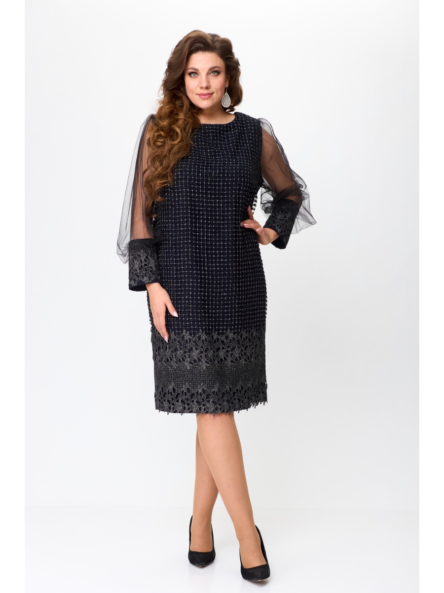 Платье женское из трёх видов ткани. Основная ткань - трикотаж с люрексом. По верху этой ткани идет плетёная сетка с кружевом. Спереди платья нагрудные вытачки. Главным украшением платья служат рукава из двойной сетки, заканчивающиеся манжетой из основной ткани с кружевом. Горловина округлая.