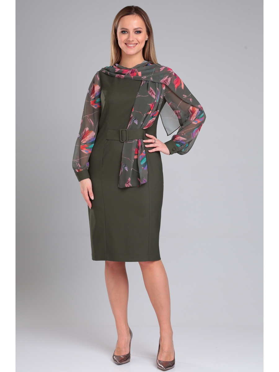 Платье женское полуприлегающего силуэта. Горловина полукруглой формы, обработана обтачкой. Перед с рельефными швами. В плечевых швах переда расположен декоративный шарфик. По линии талии в центральной части переда расположен декоративный пояс с пряжкой. Спинка с рельефными швами и средним швом, в котором расположена застежка на потайную молнию и шлица. Рукав втачной длинный, на манжете с застежкой на петлю и пуговицу.