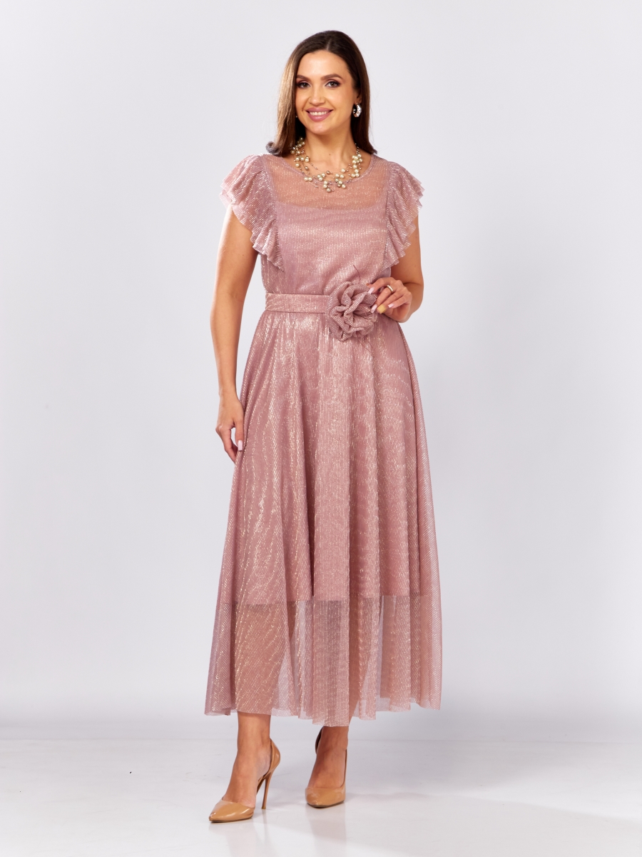 Платье женское нарядное. Прекрасно подойдет для выпускного бала и других торжеств. Отрезное по талии, на резинке. Выполнено из гофрированной ткани цвета «пыльная роза» с оттенком «металлик». Юбка со сборкой на резинке. Рукав «крылышко».