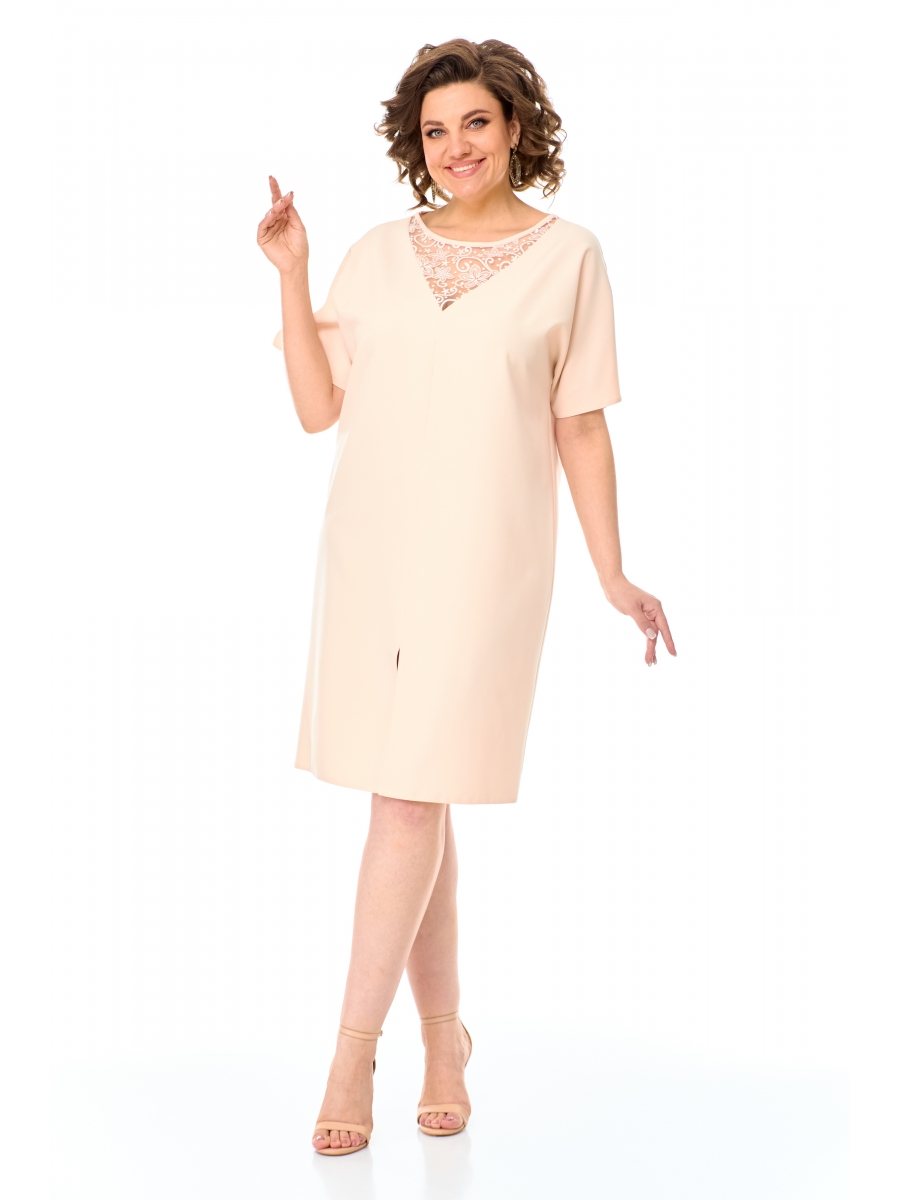 Нарядное нежное платье длины «midi» из плотной плательной ткани. Платье прямого силуэта зауженное к низу с разрезом по переду. Глубокое декольте закрыто декоративной полупрозрачной сеткой с нарядным дизайном. Рукав 3/4 цельнокроеный зауженный. Платье без подкладки.