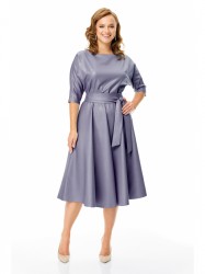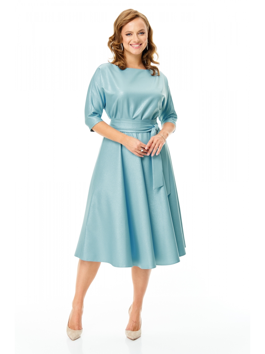 Платье нарядное из плотной плательной ткани с блеском. Лиф «летучая мышь» с цельнокроеным рукавом, зауженным к низу. Летящая юбка «полусолнце», по талии эластичная тесьма. Без застежки. Горловина овальная. Пояс длинный, завязывается на талии в два оборота.