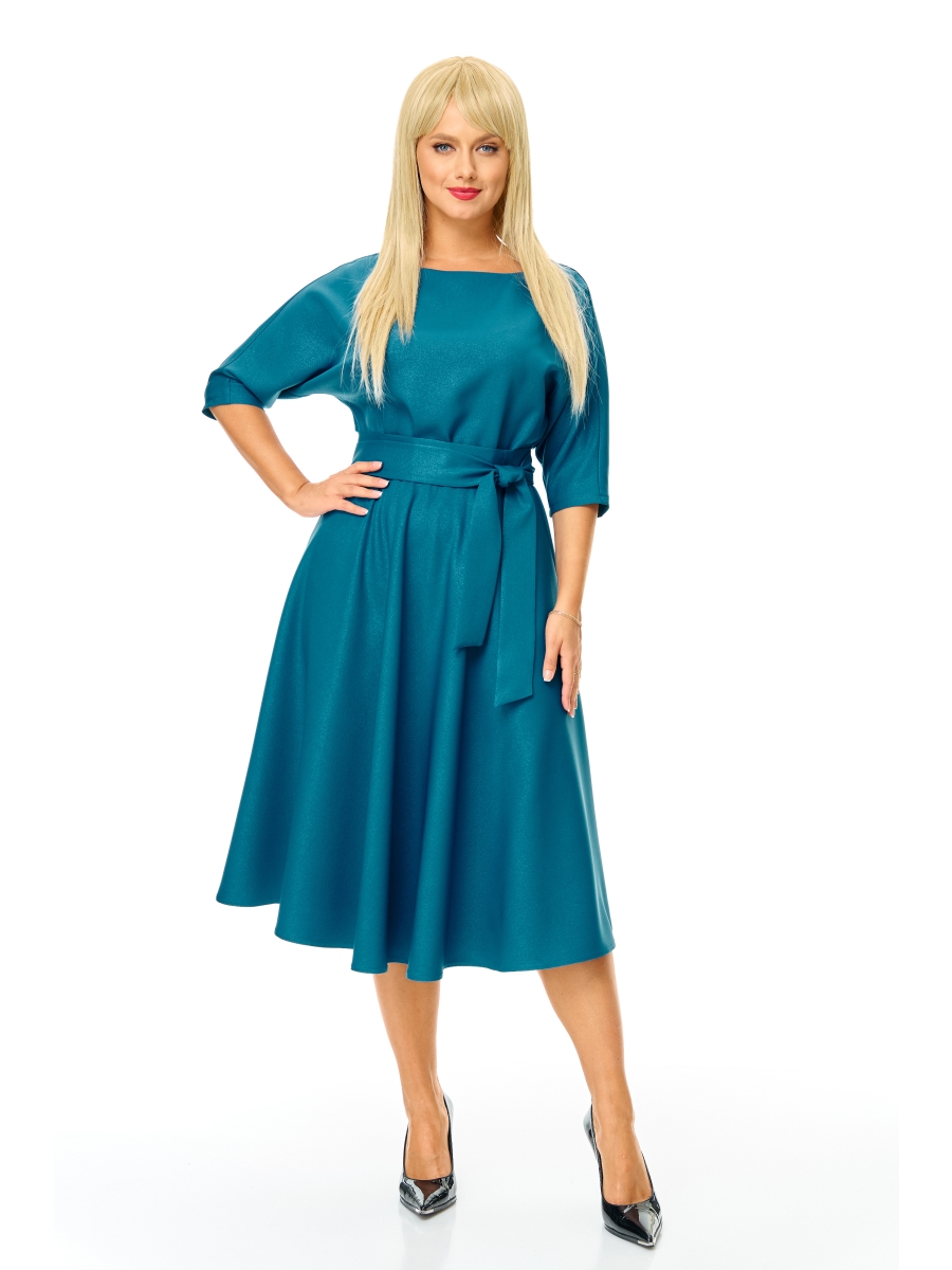 Платье нарядное из плотной плательной ткани с блеском. Лиф «летучая мышь» с цельнокроеным рукавом, зауженным к низу. Летящая юбка «полусолнце», по талии эластичная тесьма. Без застежки. Горловина овальная. Пояс длинный, завязывается на талии в два оборота.