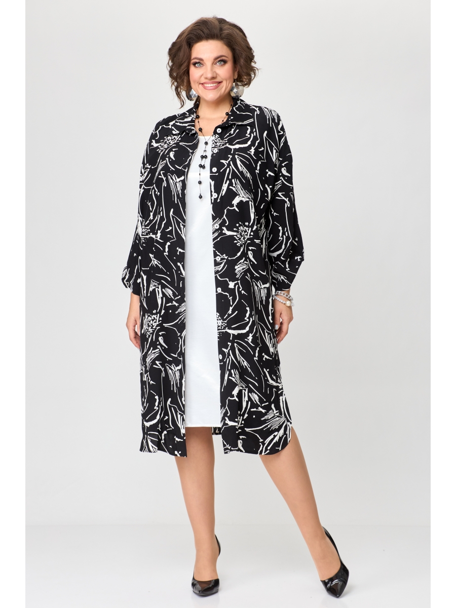 Платье состоит из удлинённой рубашки с отложным воротником. По передней части планка, застежка-пуговицы. Свободный крой, по бокам фигурные подрезы. Вторая деталь этого наряда - имитация платья. То есть передняя часть платья однотонного черного цвета вшита по боковым швам в саму рубашку и создается впечатление, что наряд двухпредметный. В расстёгнутом виде смотрится как платье и поверх надета рубашка. Однотонная часть платья выполнена из мягкой и приятной ткани. Ткань цветная на вид как плотный атлас.